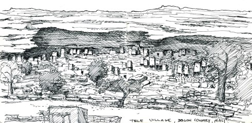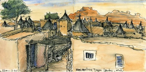 18 NovThis drawing marks the start of our trek in the Dogon Country. The Dogon Country is known for its cliff dwellings, mud villages and granaries with straw roofs all inhabited by the Dogon people. It follows along an escarpment, or cliff that runs for appx. 250 km. The Dogon Country is a popular tourist destination, though when we were there we did not see a huge amount of other tourists. We hired a guide, and were part of a group of ten. Each day we would trek with our packs and see 3-10 different villages, some situated on the valley floor, some like this in the cliff. For the most part, however, the cliff dwellings are no longer inhabited, as most people work in the fields in the valley. The Telem people were the first to inhabit the cliffs, and built amazing dwellings into little alcoves, sealing them in with mud. They seem impossible to access. But what we don’t see anymore are the lush cascading vines that used to cover the escarpment, providing both shade and a means to climb into the dwellings. In fact the valley floor used to be a thick forest, and so living up in the cliff was a safer alternative.