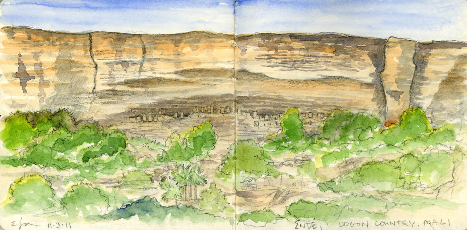 21 NovAs we trekked along the valley trail that followed the line of the escarpment in Dogon Country, there would be various cliff dwellings, the grandest depicted in the previous sketch of Tele. This one at Endé, though smaller and less complex, had a simple beauty as it faded into the red cliff. Some of us ventured up to explore the dwellings, others napped and enjoyed this amazing scenery. I took the time to sketch and do this watercolor, because I had a feeling we might not see this type of cliff dwelling again.