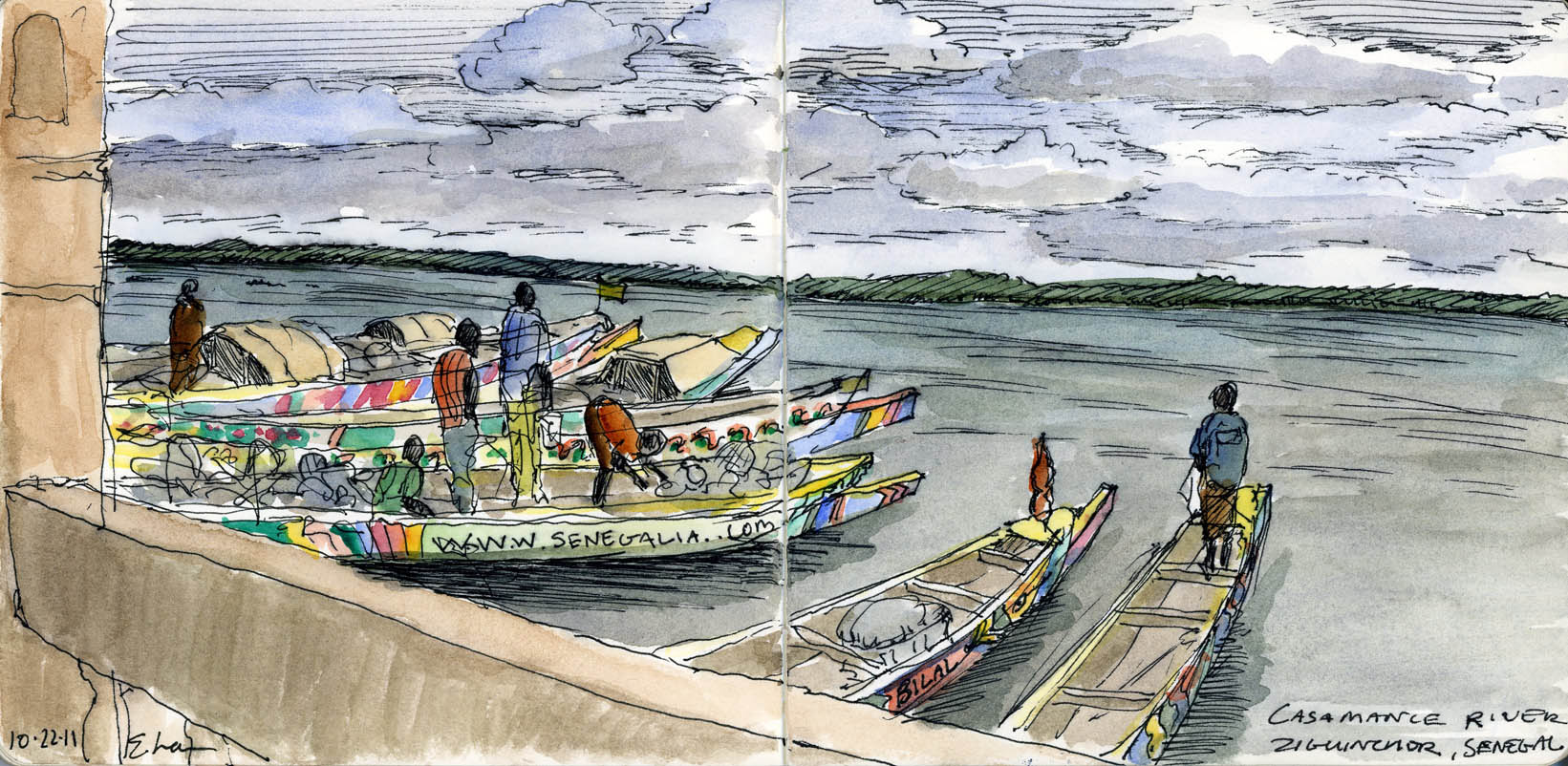 These are drawings I made several days into our journey, once we landed in Ziguinchor, Senegal. We had taken an overnight boat from Dakar, the capital, down along the Atlantic coast, entering the Casamance river delta and floating upstream on the Casamance river. Ziguinchor is a smallish fishing town, with a couple main streets and a couple main attractions. We only had one day, so we watched the coming and going of villagers along the river bank and took a small boat ride around the mangroves the flank the opposite bank. While on the boat ride, we saw many dolphins feeding and jumping all around us, as well as a variety of birds. There was even a large, half sunken ship, that had reportedly tried to get down the river with Liberian (?) immigrants until it was gunned down by police. In these drawings, there is an approaching thunder and lightning storm, and crewmen are preparing the boats for passengers to other villages along the river.