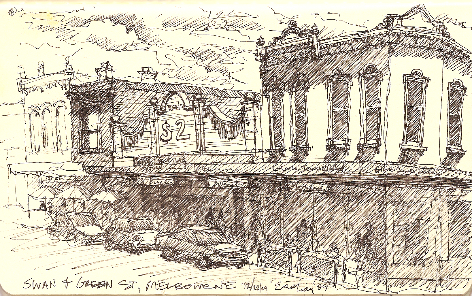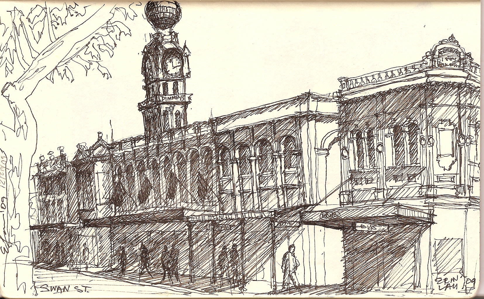 Its taken me a while to get back to sketching while I’ve been in Melbourne, but now that I’m leaving for India in 2-1/2 weeks, I feel like I should share a little of this place through my sketchbook. Right around the corner from my mom’s place is the Dimmey’s store, on Swan St. It’s a Melbourne institution. Its like a low cost department store, more comparable to Kmart back in the day. The mannequins in the storefront windows are often poorly/ half dressed and the sales clerks look weary, but they have some great finds and overall Melbourne character. In addition, the building is a gem, and thats why there is currently a petition going around to try to save Dimmey’s from becoming part of a 8-11 storey apartment building. To be fair, the development would be setback from the street, presumably saving the historical facade. But the highest building on this street is only 4 storeys, 8 storeys would utterly dwarf the surrounding buildings. We hope the unique urban fabric of this part of Melbourne will be respected. More to come!