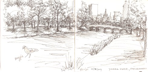23 DecI like to sit by the Yarra River, its only a 5 min bike ride or 10 min walk from my house. Its banks are flanked by shady grass knolls and mature Gum Trees (eucalyptus) and another full grown species that provides excellent shade. I like that the river has this natural bank, at least until it enters the downtown area, its banks are devoid of concrete, and theres nothing stopping you from jumping in. Throughout the day, rowing teams glide past, egged on by a coach on a bicycle who rides alongside them on the trail, yelling through a bullhorn. I must have chosen a day to draw when they were doing other things, because most of the time you cant help but see them. I also ride my bike along the river, its a place where all the city’s runners go as well. And through my riding experience, I’ve gotten to the point where I automatically go to the left-hand side of the road, like drivers here, to avoid head-on collisions. It took my mom about a year before she felt comfortable driving a car here on the left side of the road. I don’t blame her.