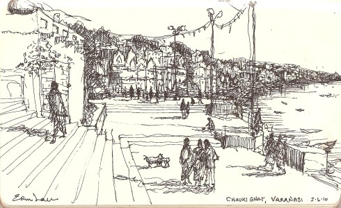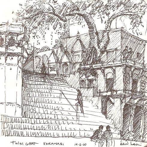 I arrived in Varanasi (aka Benares or Kashi) in February, after one month of traveling in Rajasthan and Uttarkhand. Unfortunately I’m skipping ahead over my time in Uttarkhand because I failed to make any drawings while I was there. But I had stayed at an amazing school and ashram in the mountains surrounded by happy, tiny children, and briefly passed through Rishikesh and Haridwar on my way to Varanasi. I drew this particular sketch just after sunrise.
